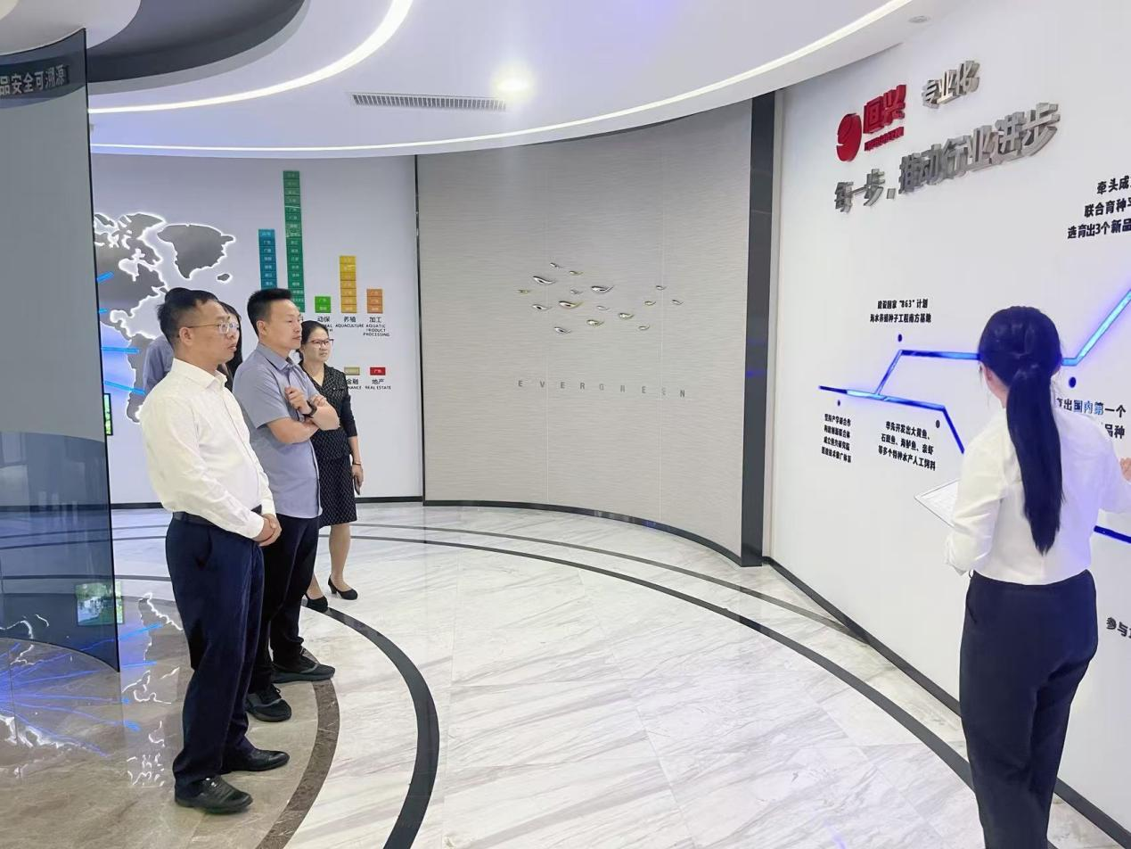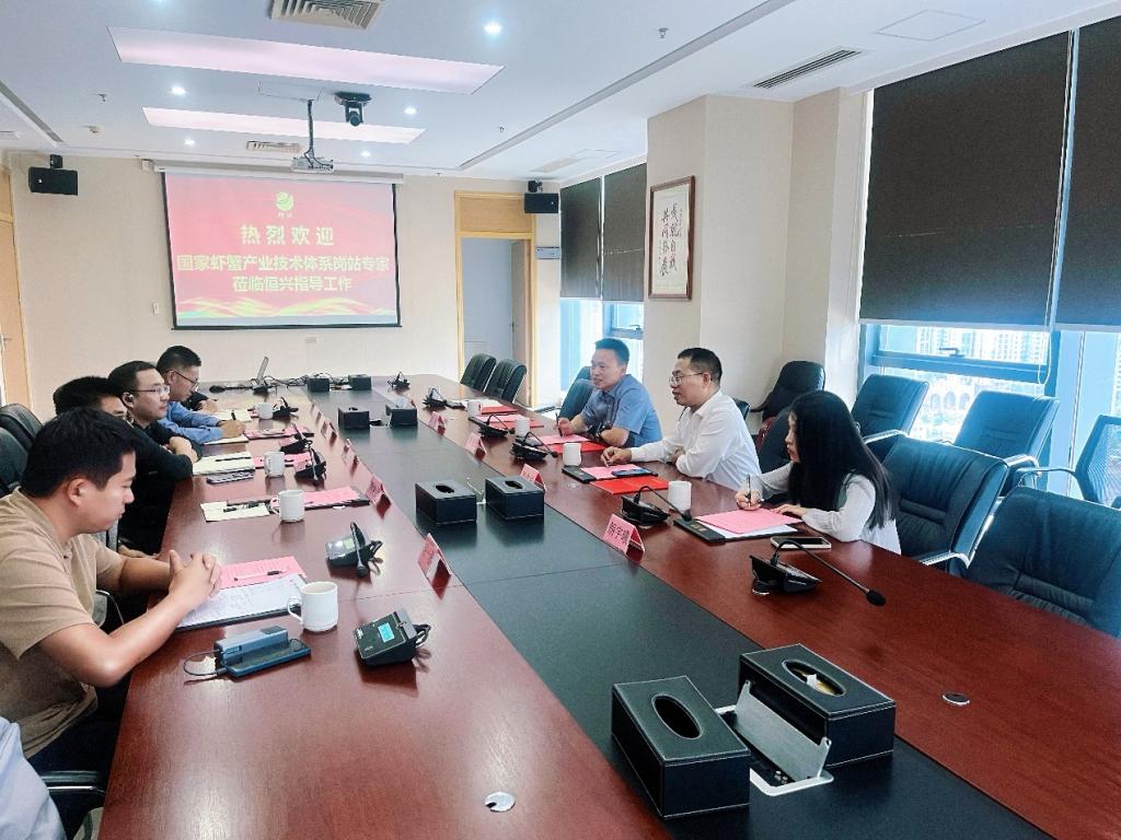 在广东恒兴集团有限公司,集团常务副总裁、研究院院长张海涛,院办副主任、国家虾蟹产业技术体系湛江综合试验站站长赵丽梅,研究院院长助理、水产饲料所所长姜永杰,种苗所所长陈奕彬,以及高级研发工程师胡一丞等领导与专家,分别介绍了公司在凡纳滨对虾育种、育苗、养殖、饲料研发、动保产品开发、水产品加工等领域的产业优势及科研合作需求。双方表示,期待未来能够进一步加强合作,共同推动凡纳滨对虾全产业链的绿色、智能、高质量发展。