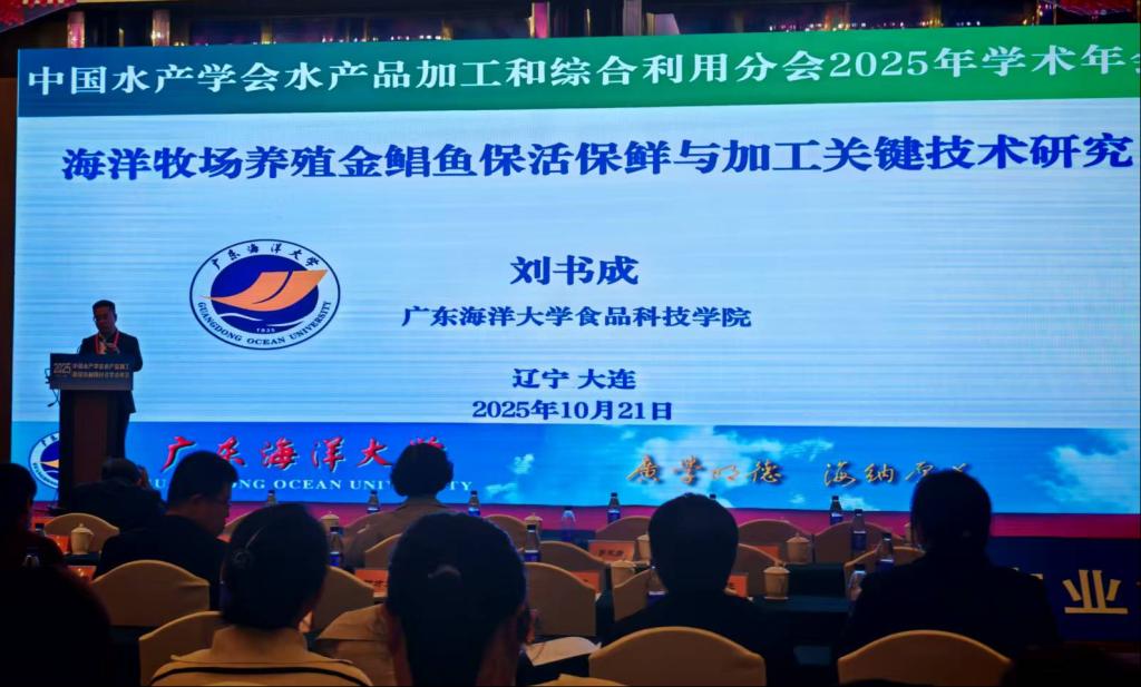10月20-23日,食品科技学院刘书成教授、高加龙教授带领学院教师和研究生参加了在辽宁省大连市召开的中国水产学会水产品加工和综合利用分会2025年学术年会。刘书成教授受邀在大会论坛上作了“海洋牧场养殖金鲳鱼保活保鲜与加工关键技术研究”的学术报告,学院教师和研究生分别在专题论坛和研究生论坛上做了学术报告,充分展示了我校师生在海洋水产品保鲜、加工与高值化利用等领域的创新成果。通过与国内水产品加工领域专家的深入交流,加强了学院的交流合作,推动学院学科高质量发展。