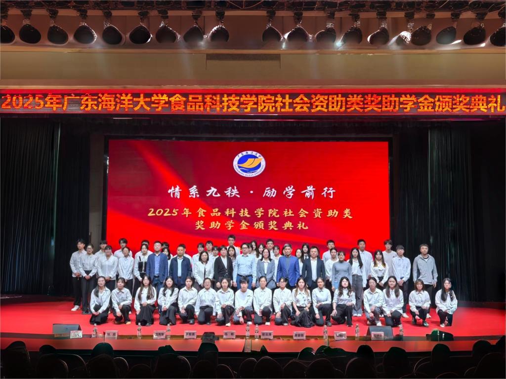 12月17日,广东海洋大学食品科技学院在广学楼多功能厅举行2025年社会资助类奖助学金颁奖典礼,共颁发“启圆励志奖学金”“华栋助学金”“九秩未来奖学金”共计10万元,51名优秀本科、研究生学子获表彰。学院与系领导、华栋集团营销副总裁林良先生、广东蔚徕实验室科技发展有限公司唐碧蓉总经理等企业代表出席会议,会议由学院党委副书记罗智勇主持。
