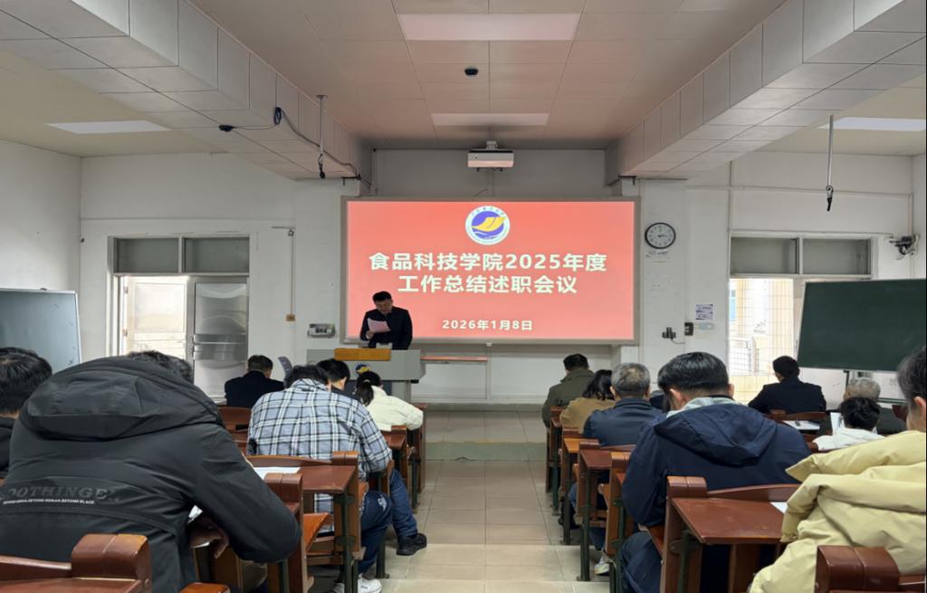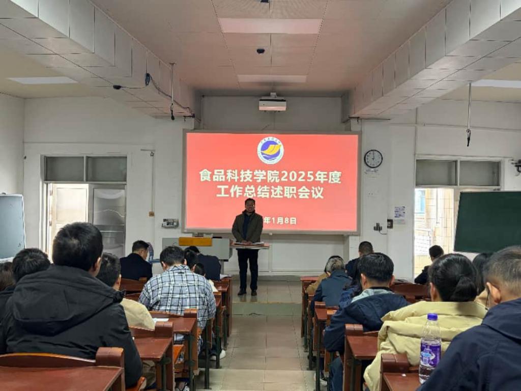 2026年1月8日,食品科技学院在广学楼231多媒体教室召开了2025年度工作总结述职会议。学院领导班子及全体教职工参加会议,会议由院长刘书成主持。