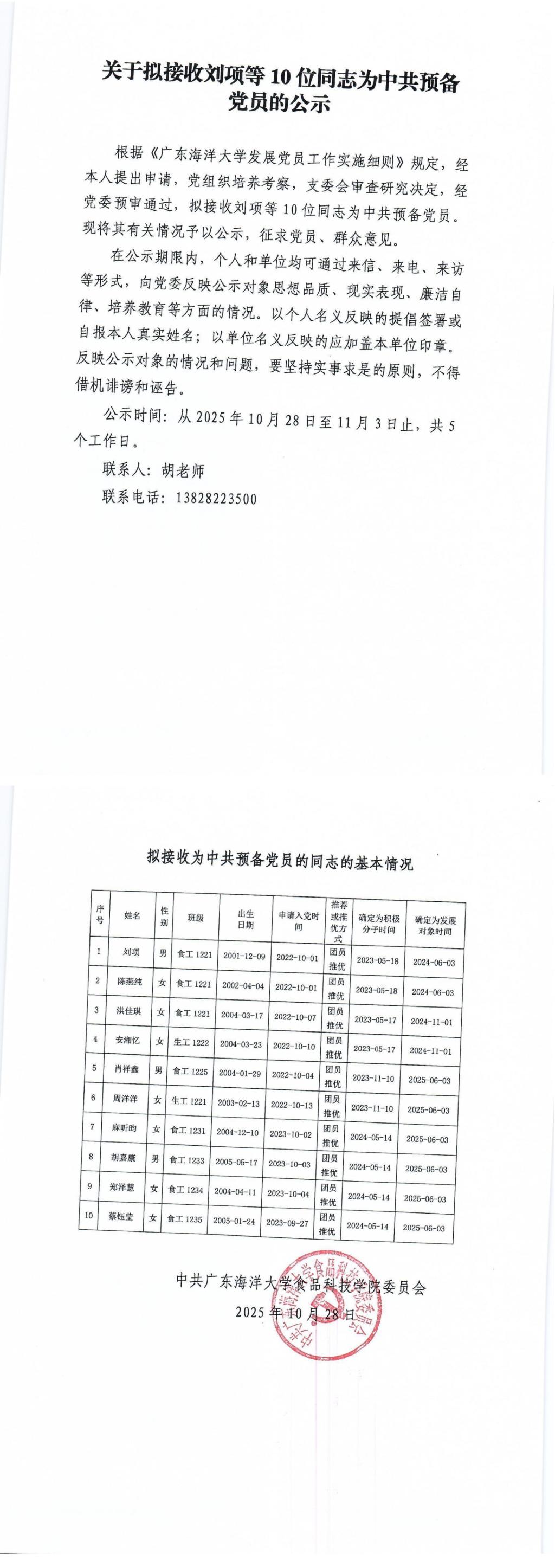 根据《广东海洋大学发展党员工作实施细则》规定,经本人提出申请,党组织培养考察,支委会审查研究决定,经党委预审通过,拟接收刘项等10位同志为中共预备党员。现将其有关情况予以公示,征求党员、群众意见。