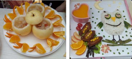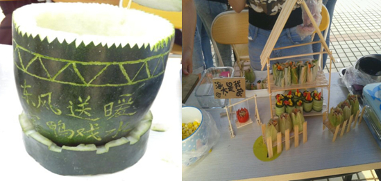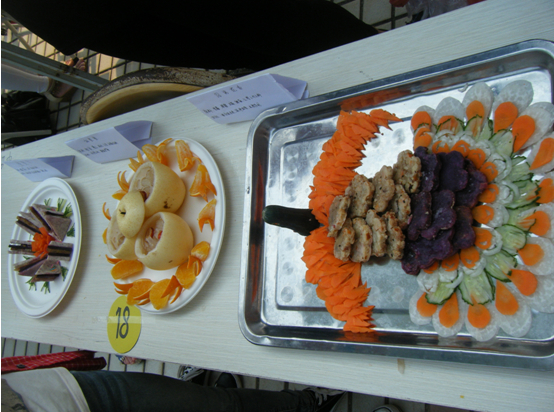 炎热的天气并没有阻挡选手们的参赛热情,比赛在韦倩妮老师的致辞之后拉开帷幕。接下来就是28组参赛选手们施展身手的时候了。能工巧手的选手们团结合作,不一会儿,一道道美食便初现雏形。凉拌海蜇等潮汕美食一条龙、唐伯虎点秋香米饭套餐、海大是我家、万紫千红、竹竹高升、东风送暖,寒鸭戏水等各具特色的菜式吸引了不少观众的目光。其中,海味汤圆团队炖制的鲜美的海鲜汤让人回味无穷。“海大是我家”团队的蔬菜裹肉,营养搭配好,再加上那精致的竹楼装饰,赢得了评委好评。Sweet团队的三道小菜式,无论是孔雀造型和绝妙的味道,都让评委和观众们拍手叫好。