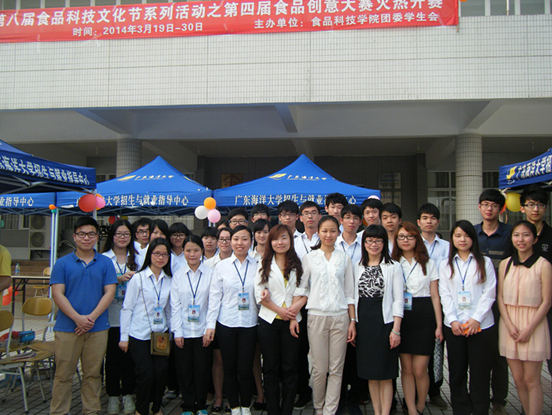 2014年3月30日下午,第八届食品科技文化节系列活动之第四届食品创意大赛决赛在校体育馆前隆重举行。食品科技学院团委书记韦倩妮、学院老师谢主兰、辅导员张丽、院团委副书记何梓杨、院学生会副主席谢镇坤担任本次活动评委。出席本次活动的嘉宾有:校监管部副部长张凤鸣和学院团委学生会各部门部长。