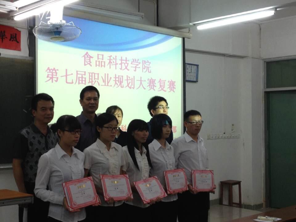 2014年10月9日,食品科技学院在主楼大课室举办主题“规划理想职业,成就美好人生”第七届职业规划大赛。学校招生与就业指导中心秦红明科长、学院党委副书记陈金水、辅导员、班主任、学生代表等60多人参加。本次大赛评委由秦红明、陈金水、刘鲸和张丽等老师担任,选手们通过演讲、PP演示和现场模拟展示等,评委严格评审;庄娟璇等7名同学脱颖而出,获取学院职业规划新星称号。作品将参加2014年广东海大学大学生职业生涯规划大赛比赛。