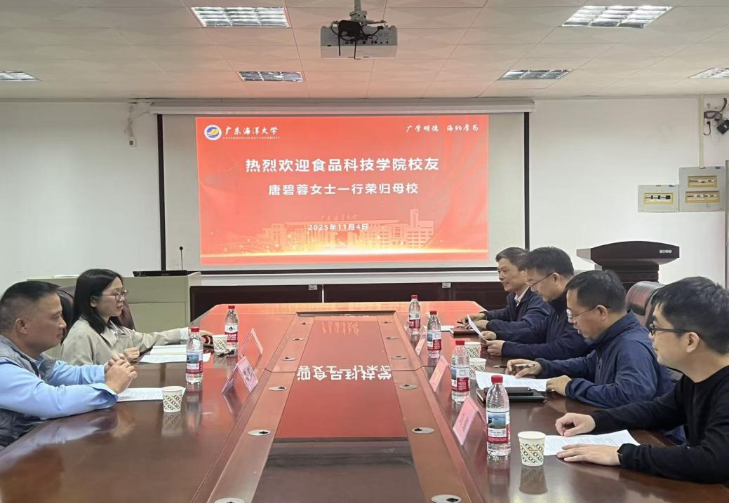 2025年11月4日上午,食品科技学院优秀校友唐碧蓉女士一行荣归母校,校友座谈会暨广东海洋大学“九秩未来奖学金”实施细则洽谈会在望海楼A105会议室隆重举行。学院党委书记伍彬、院长刘书成、党委副书记罗智勇及辅导员刘鲸参加了会议。会议由罗智勇主持。